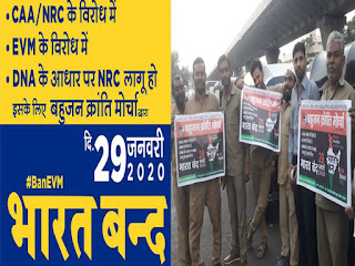 नई दिल्ली: नागरिकता संशोधन कानून (सीएए), राष्ट्रीय नागरिक रजिस्टर (एनआरसी) और ईवीएम के विरोध में बहुजन क्रांति मोर्चा ने आज (बुधवार) भारत बंद का आह्वान किया है। कई संगठनों समेत इस भारत बंद को शाहीन बाग की महिलाओं ने भी समर्थन दिया है। इस भारत बंद के आह्वान का मुख्य एजेंडा CAA, NRC और EVM का विरोध है। साथ उनकी मांग है कि डीएनए के आधार पर NRC लागू हो।