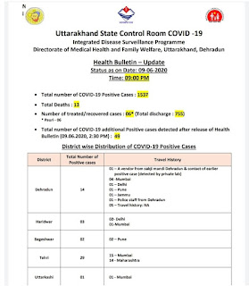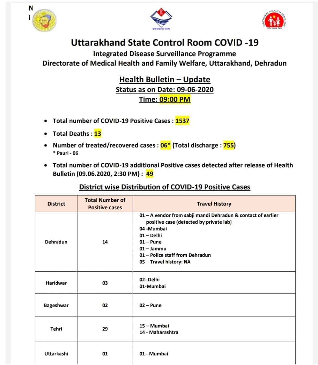 देहरादून,9,जून,स्वास्थ्य बिभाग के द्वारा जारी 9 बजे के हेल्थ बुलेटिन के अनुसार ।