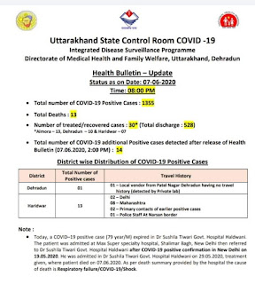 प्रदेश के स्वास्थ्य विभाग द्वारा यहां जारी बुलेटिन के अनुसार, पिछले 24 घंटों में दून मेडिकल कॉलेज में भर्ती दो और कोविड-19 संक्रमित मरीजों की मृत्यु हो गई है । ताजा मामलों में सर्वाधिक 14 नये मरीज हरिद्वार जिले से हैं जबकि छह बागेश्वर, तीन-तीन देहरादून और टिहरी से, दो-दो उधमसिंह नगर और नैनीताल तथा एक नया मरीज चंपावत से है। अन्य सात नये मामलों की पुष्टि निजी प्रयोगशालाओं से हुई है जिसका विवरण नहीं दिया गया है ।