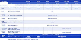 इसके अतिरिक्त जियो सिलवर प्लान की कीमत 849 रुपए है, जिसमें यूजर्स को 100 एमबीपीएस की स्पीड से 200 जीबी + 200 जीबी अतिरिक्त डेटा मिलेगा। इस प्लान में भी यूजर्स को फ्री वॉइस कॉलिंग ऑल ओवर इंडिया, टीवी वीडियो कॉलिंग और कॉन्फ्रेंसिंग , होम नेटवर्किंग आदि सेवा मिलती है।