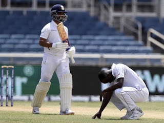 इससे पहले भारत ने अपनी दूसरी पारी 168/4 के स्कोर पर घोषित की। भारत की शुरुआत अच्छी नहीं रही। केमार रोच ने मेहमान टीम को तीन तगड़े झटके दिए। उन्होंने ओपनर्स मयंक अग्रवाल (4), केएल राहुल (6) और कप्तान विराट कोहली को अपना शिकार बनाया। कोहली खाता भी नहीं खोल सके। वहीं कैरेबियाई कप्तान जेसन होल्डर ने चेतेश्वर पुजारा (27) को पवेलियन भेजा। इसके बाद अजिंक्य रहाणे और हनुमा विहारी ने अपना जलवा बिखेरा। दोनों ने पांचवें विकेट के लिए 111 रन की अविजित साझेदारी की।