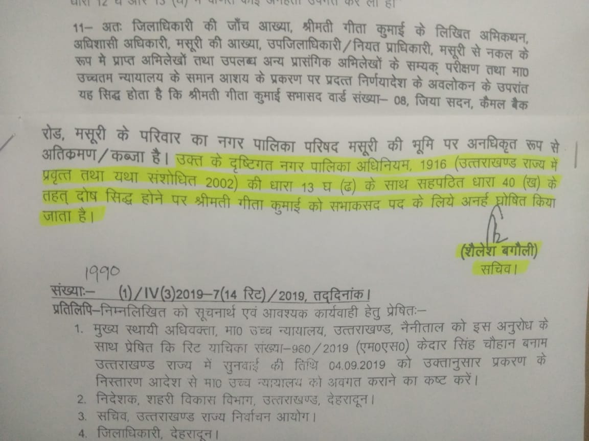 बता दे कि गीता कुमई के पति भरत कुमई के नगर पालिका की भूमि पर अतिक्रमण का मामला ऒर गीता कुमई का चुनाव में झूठा एफिडेफिट देने के मामले को लेकर केदार चौहान ने हाई कोर्ट में एक कैश दाखिल किया था।जिसका संज्ञान लेते हुए हाई कोर्ट ने उत्तराखंड शासन को आदेश जारी किए थे।कि गीता कुमई ने पालिका की भूमि पर अवैध अतिक्रमण किया हुआ है।