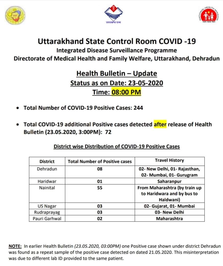 देहरादून,23,मई आज रात्री 8 बजे स्वास्थ्य विभाग उत्तराखंड द्वारा जारी कोरोना हेल्थ बुलेटिन में प्रदेश में 72 नए कोरोना संक्रमित की पुष्टि के बाद अब प्रदेश में कोरोना संक्रमित मामलों की संख्या 244 हो गयी है।