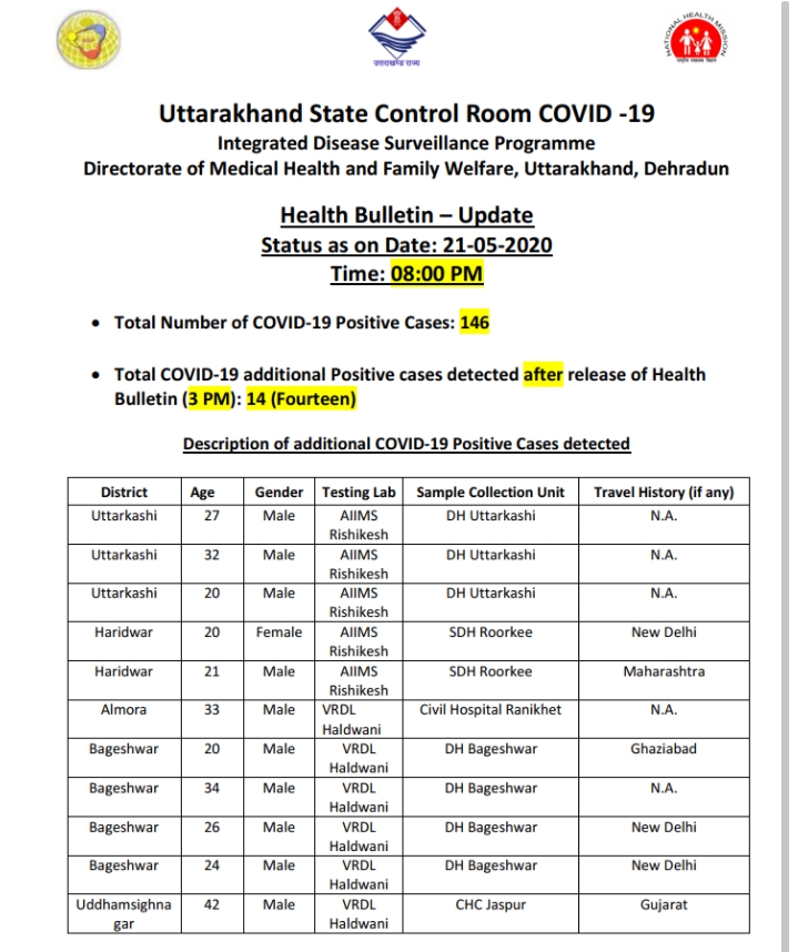 देहरादून,21,मई आज रात्री 8 बजे स्वास्थ्य विभाग उत्तराखंड द्वारा जारी कोरोना हेल्थ बुलेटिन में प्रदेश में 14 कोरोना संक्रमित मिलने के बाद अब प्रदेश में  कोरोना संक्रमित मामलों की संख्या 146 हो गयी है।
