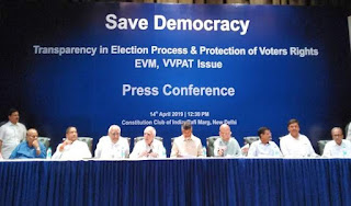 नयी दिल्ली। विपक्षी दलों ने रविवार को ईवीएम में गड़बड़ी को लेकर बैठक की और कहा कि कम से कम 50 प्रतिशत मतदान पर्चियों का मिलान ईवीएम से कराए जाने की मांग को लेकर वे उच्चतम न्यायालय का रुख करेंगे। आंध्र प्रदेश के मुख्यमंत्री चंद्रबाबू नायडू ने बताया कि 21 राजनीतिक दल 50 प्रतिशत मतदान पर्चियों का मिलान ईवीएम से कराए जाने की मांग कर रहे हैं। नायडू ने शनिवार को मुख्य चुनाव आयुक्त सुनील अरोड़ा से मुलाकात कर ईवीएम गड़बड़ी का मामला उठाया था।