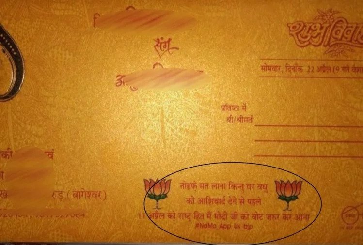 शादी के निमंत्रण कार्ड पर भाजपा के चुनाव चिह्न कमल और भाजपा को वोट देने की अपील की गई है। निर्वाचन आयोग ने इस मामले को गंभीरता से लेते हुए आदर्श आचार संहिता के उल्लंघन का मामला माना है।